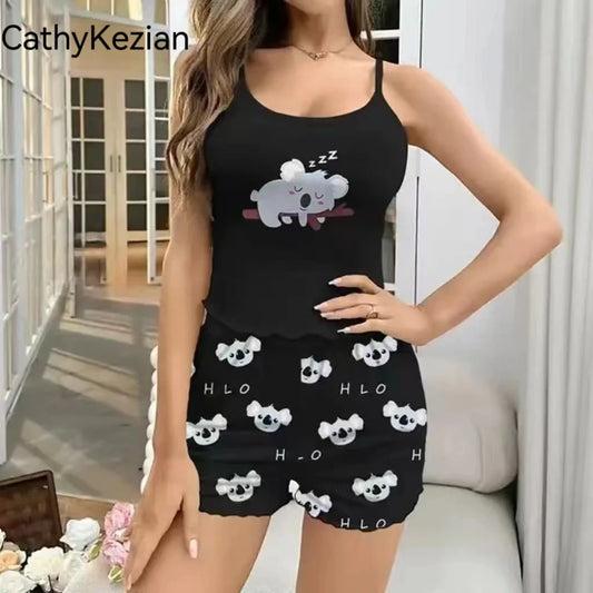 Women Pajamas Sleepwear Pajama Set Sports Camisole and Shorts S M L Black Cartoon Koala Print Ventilate Casual Soft Comfortable